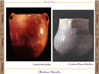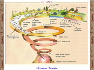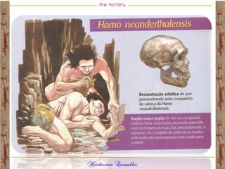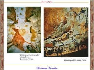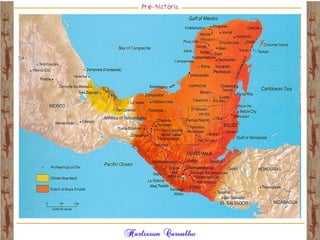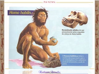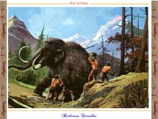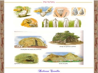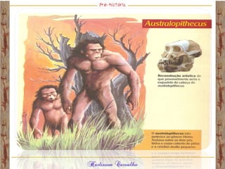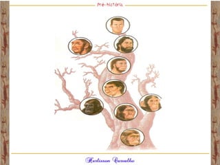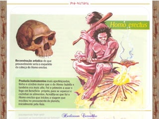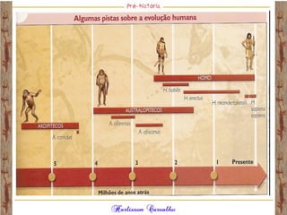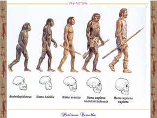 O documento discute a origem e evolução dos seres humanos desde os primeiros hominídeos até as civilizações pré-colombianas nas Américas. Aborda tópicos como a pré-história, a evolução anatômica dos hominídeos, as principais culturas pré-históricas como os astecas, maias e incas, além das teorias sobre a origem dos primeiros povos nas Américas.