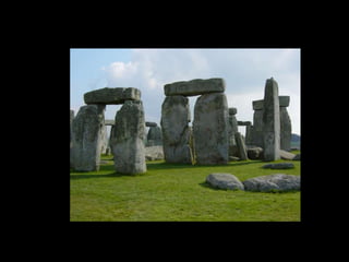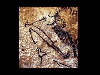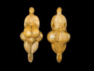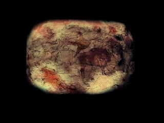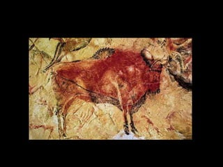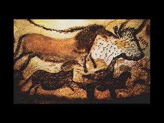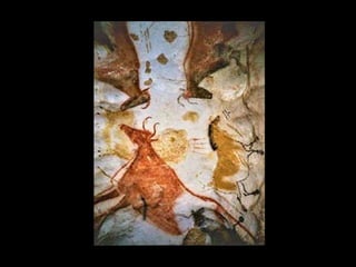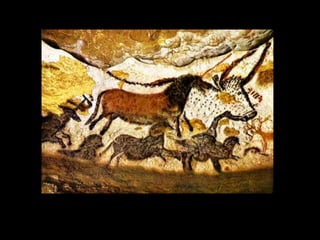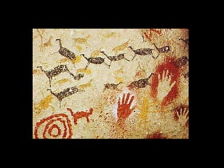 O documento discute as primeiras representações artísticas da humanidade, desde as pinturas rupestres do Paleolítico até as construções megalíticas do Neolítico. Apresenta exemplos de arte rupestre encontrados em cavernas na Espanha e França, além de esculturas femininas do Paleolítico. Também descreve sítios arqueológicos no Brasil, como a Serra da Capivara, e monumentos como Stonehenge e os alinhamentos de pedras em Carnac.