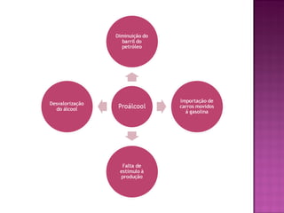 O documento descreve o programa brasileiro de substituição de derivados de petróleo por álcool combustível entre 1975 e 2000. O programa evitou a importação de petróleo e reduziu as emissões de gases, além de gerar economia de divisas. O documento também discute o potencial do biodiesel no Brasil usando matérias-primas renováveis como óleos vegetais e animais.