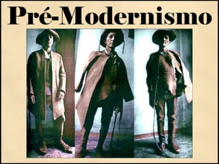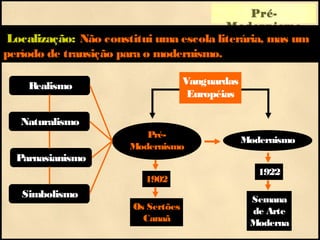 O documento descreve o período Pré-Modernismo no Brasil como um tempo de transição entre os estilos literários do final do século XIX para a Semana de Arte Moderna de 1922. A literatura pré-modernista retratava de forma crítica a sociedade brasileira desigual através de obras de Euclides da Cunha, Lima Barreto e Monteiro Lobato entre outros.