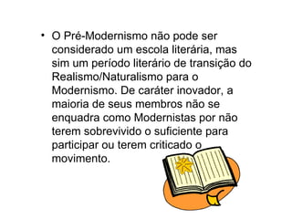 O Pré-Modernismo marcou a transição entre o Realismo/Naturalismo e o Modernismo na literatura brasileira. Caracterizou-se por obras que expunham a realidade social brasileira em transformação na época, com a urbanização e imigração em São Paulo e a crise do café no Nordeste. Autores principais foram Euclides da Cunha, Lima Barreto e Monteiro Lobato.