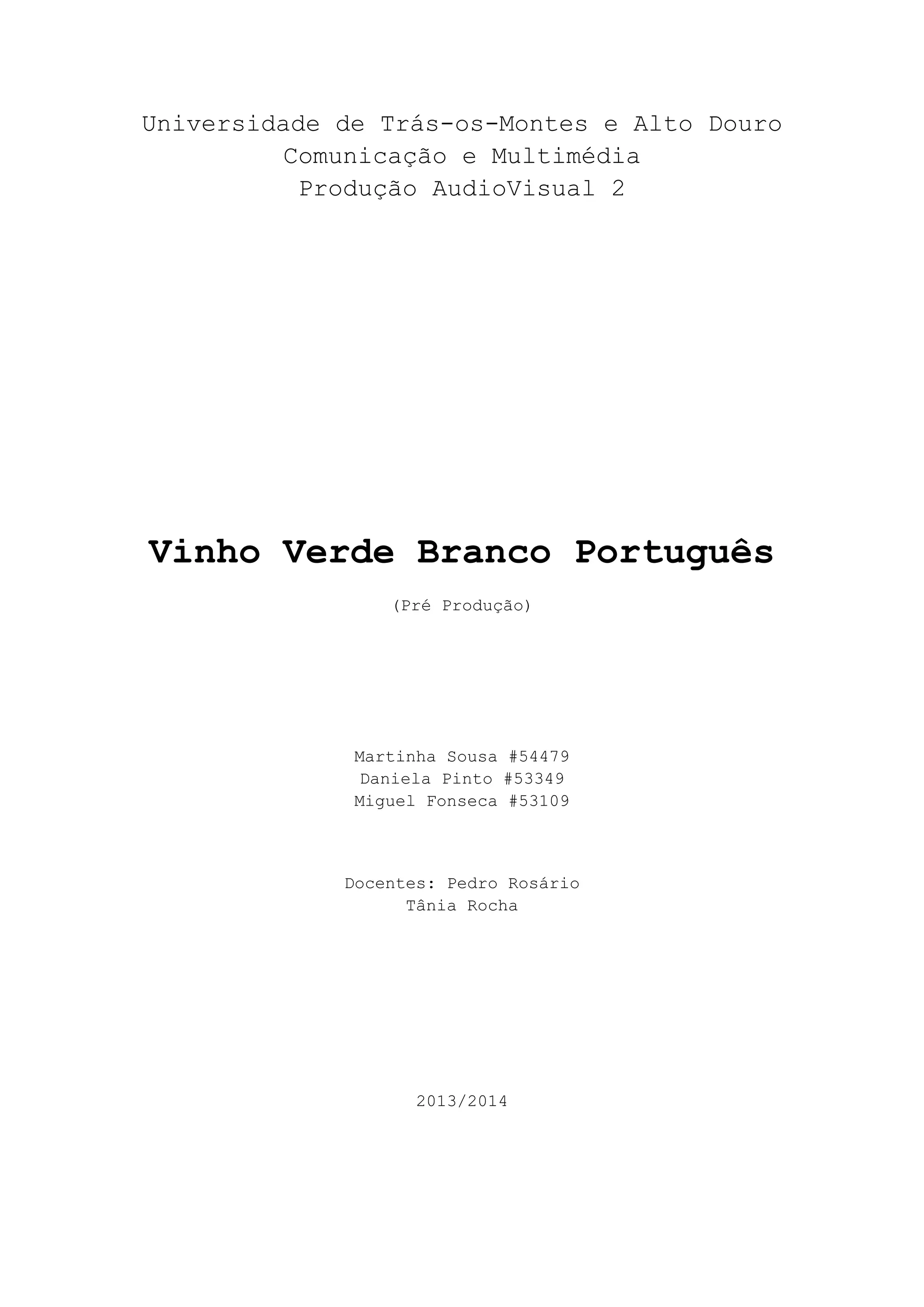 O documentário apresenta o processo de produção do vinho branco português, desde a colheita das uvas até à sua transformação em vinho. Inclui planos das vinhas, da colheita manual das uvas, do transporte e processamento das uvas. Apela a um consumo moderado e saudável do vinho branco português.