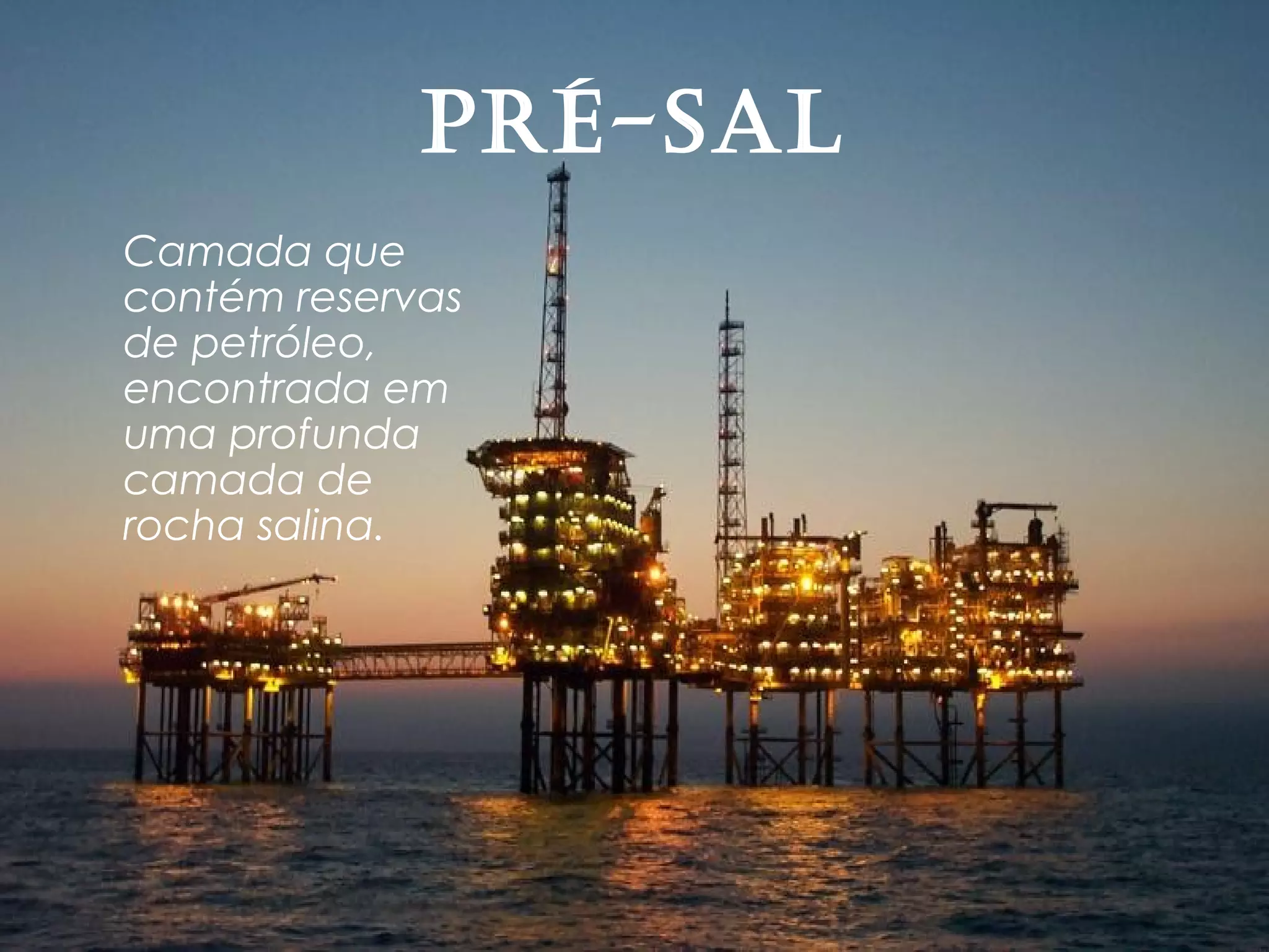 O documento descreve o pré-sal, uma camada de rocha salina no fundo do mar brasileiro que contém grandes reservas de petróleo e gás natural. O pré-sal tem melhor qualidade de petróleo do que camadas acima, e é mais profundo que a maioria das reservas mundiais. No entanto, as empresas Chevron e Transocean tentaram perfurar a camada pré-sal no campo de Frade sem as devidas autorizações ou condições de segurança, causando um vazamento em 2011.