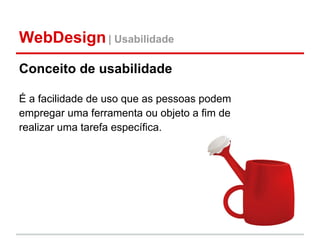 O documento discute princípios de usabilidade na webdesign. Ele explica que usabilidade é a facilidade de uso de um site e porque isso é importante para reter usuários. Ele também lista dez princípios básicos de usabilidade como não fazer o usuário pensar muito e manter a simplicidade.