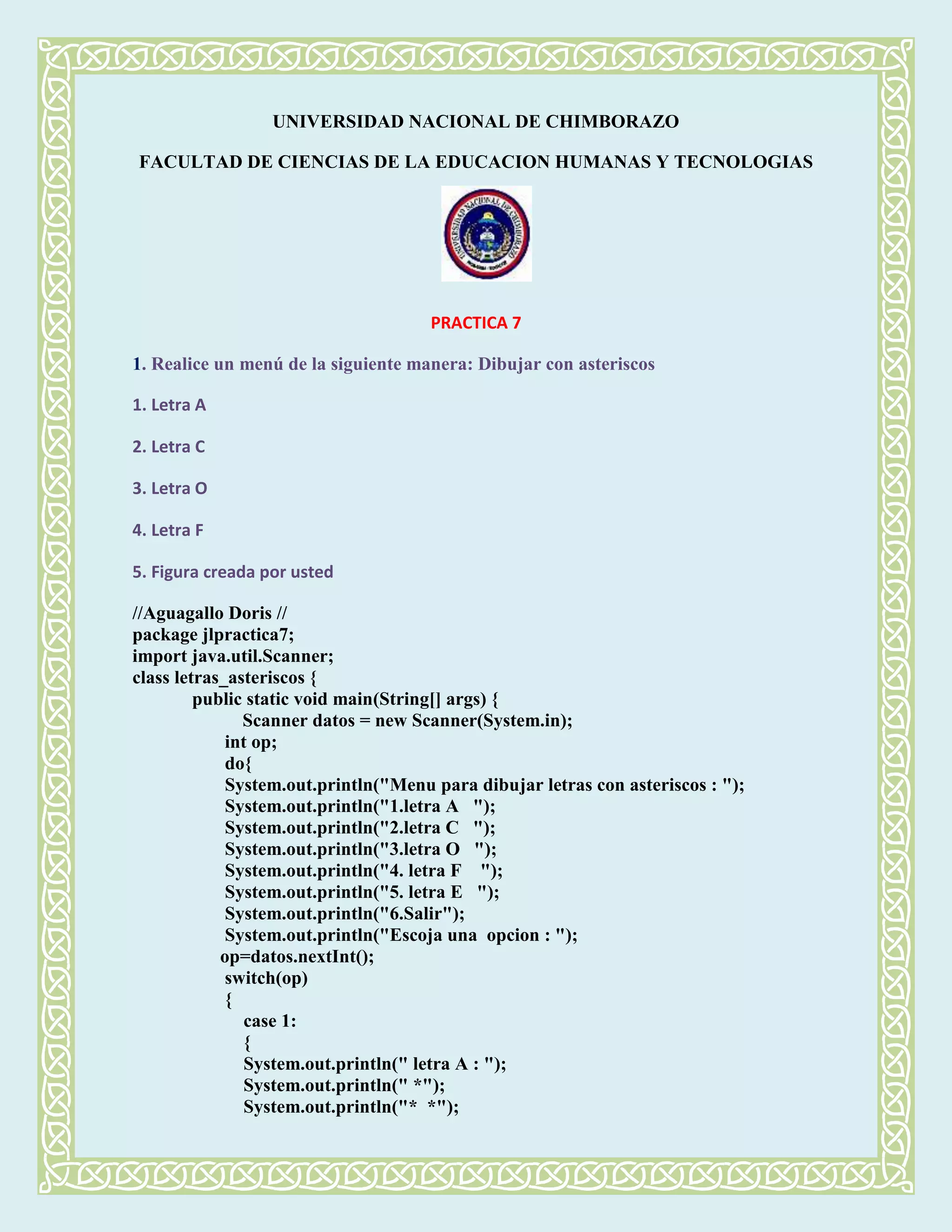 System.out.println("Menu para dibujar letras con asteriscos : ");