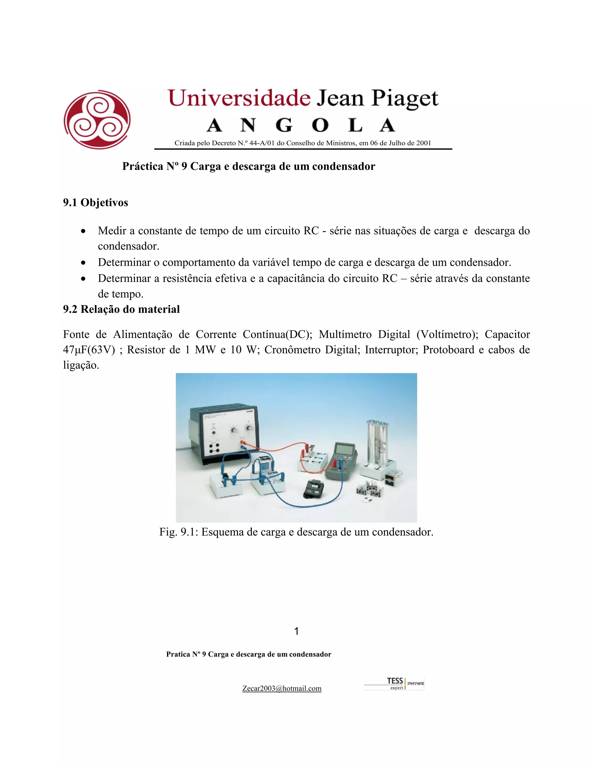 [1] O documento descreve um experimento para medir o tempo de carga e descarga de um condensador em um circuito RC. [2] Ele explica a teoria por trás do processo de carga e descarga de um condensador através de equações diferenciais e a constante de tempo. [3] O procedimento experimental é detalhado, incluindo a montagem do circuito, medições de tensão, tempo de carga e descarga e análise dos resultados.