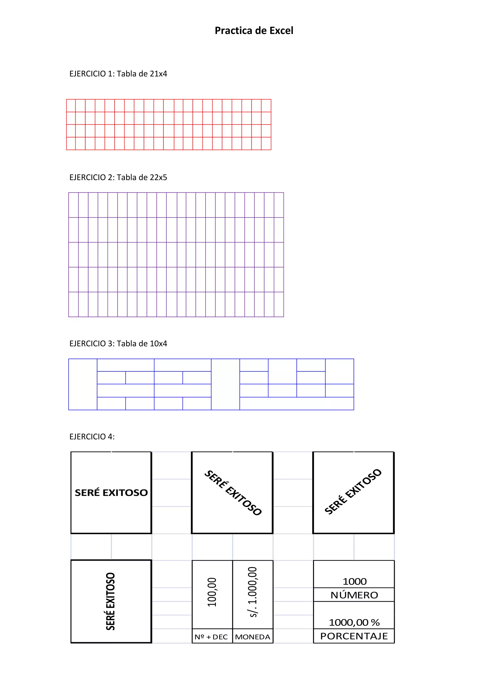 O documento apresenta uma série de exercícios em Excel, incluindo a criação de tabelas com diferentes números de linhas e colunas, uma fórmula para calcular porcentagens e uma tabela com datas e horas.