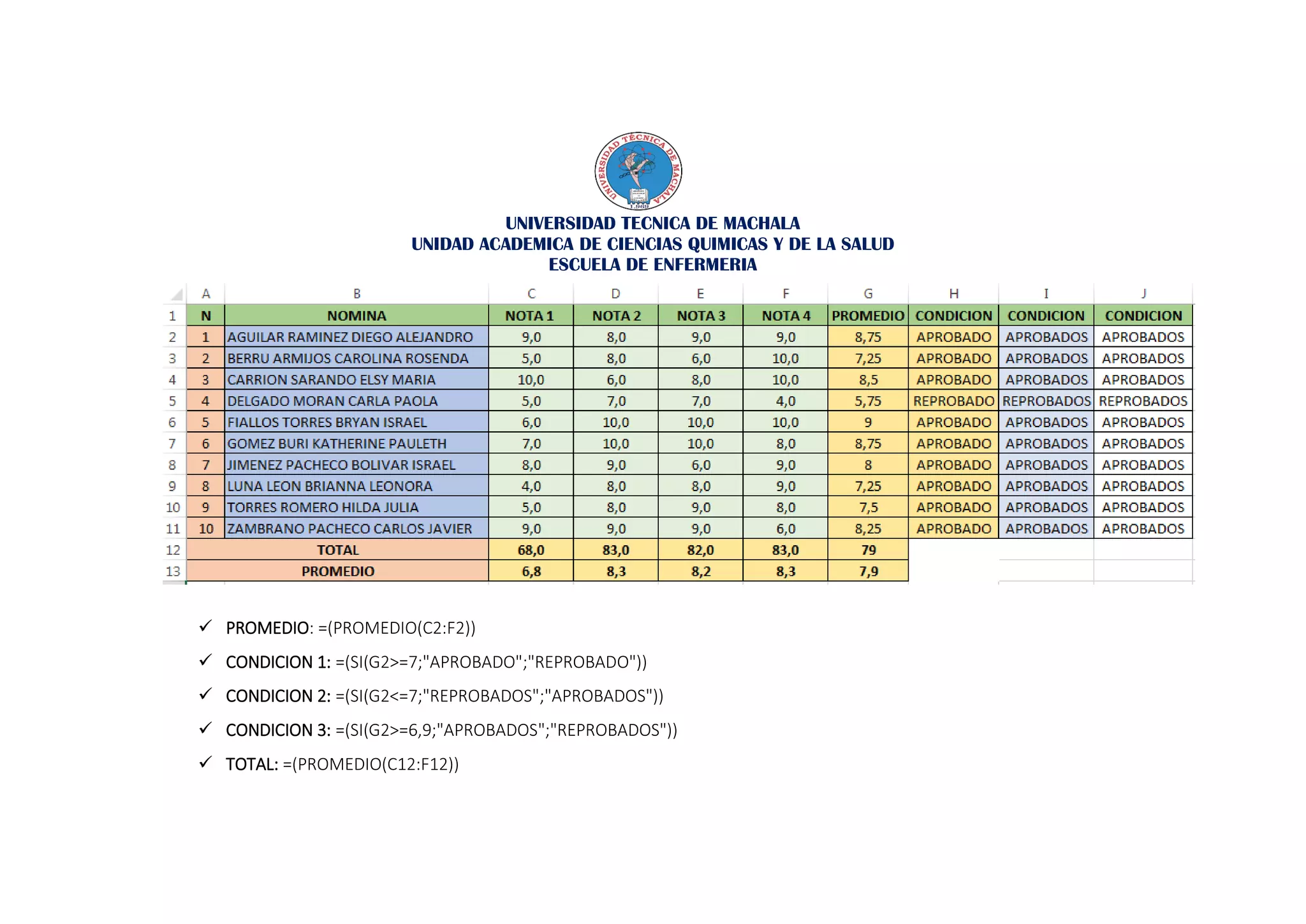 O documento calcula e resume as notas de alunos de enfermagem. Ele lista a fórmula para calcular a média, e usa condições lógicas para determinar se os alunos foram aprovados ou reprovados baseado em diferentes notas de corte.