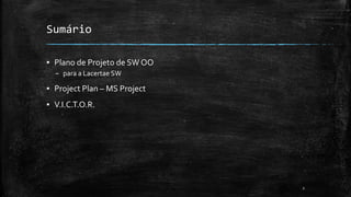 Este documento apresenta um plano de projeto de software orientado a objetos para a empresa Lacertae Software, incluindo um projeto no Microsoft Project e recursos no site V.I.C.T.O.R. para auxiliar na gestão e certificação de projetos. Links são fornecidos para obter mais detalhes sobre a especificação do sistema e conteúdos sobre gestão de projetos. Apresentações dos seminários devem ser disponibilizadas nos blogs das equipes.