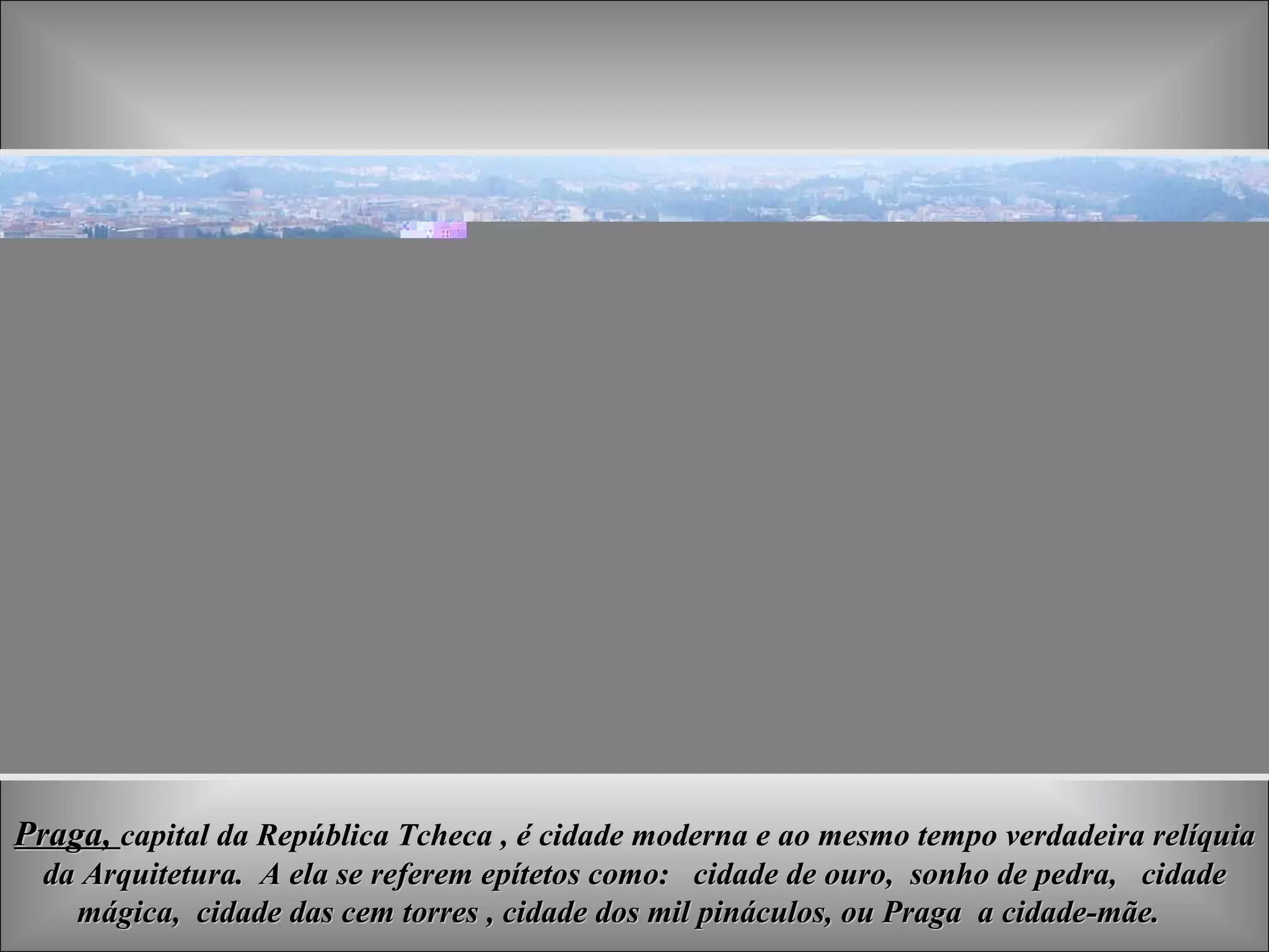 O documento descreve a arquitetura e a história da cidade de Praga, capital da República Tcheca. Ele destaca o Castelo de Praga, a Catedral de São Vito e outros monumentos históricos, além de compositores tchecos como Smetana e Dvořák que foram inspirados pela cidade.