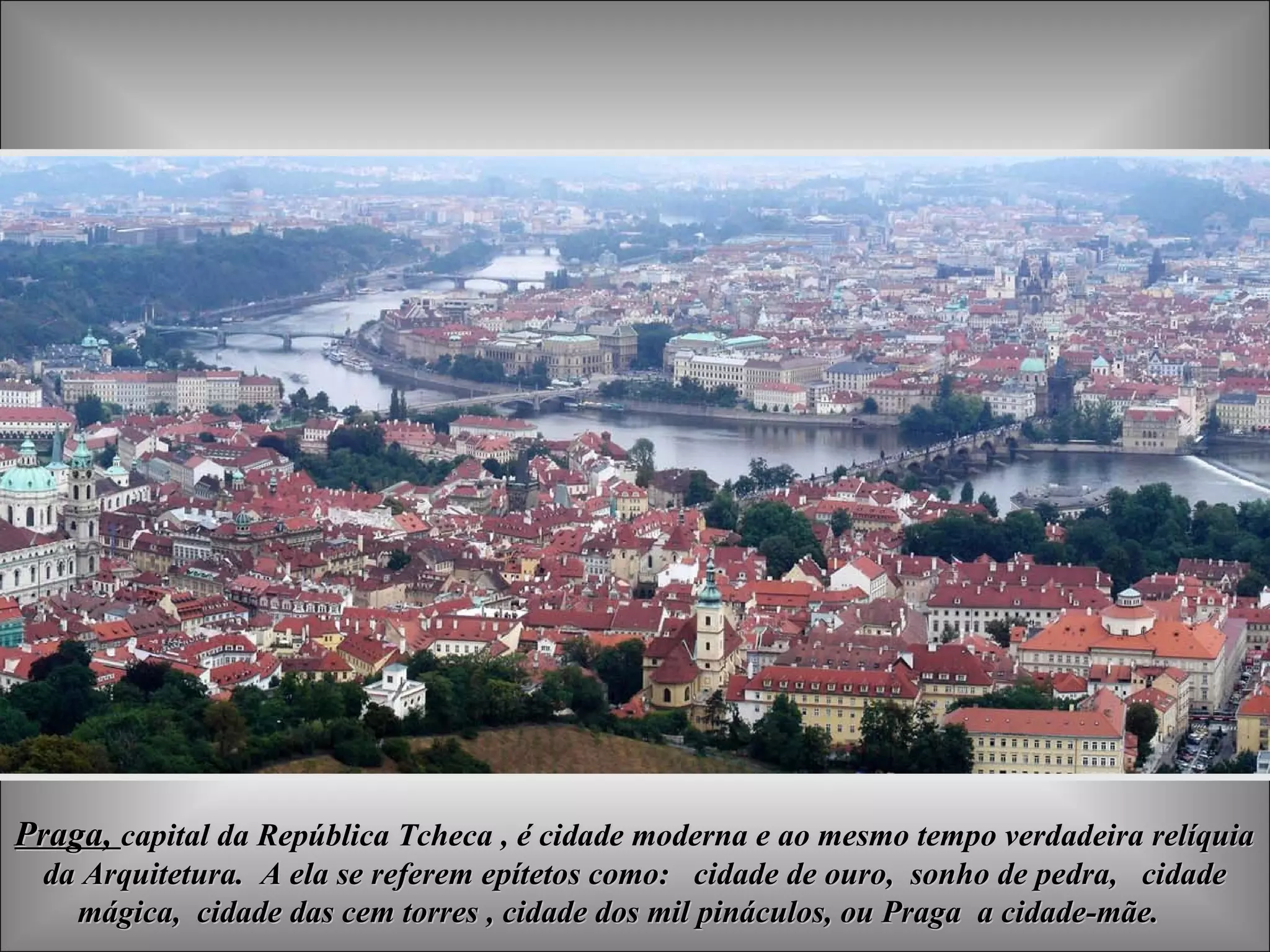 Praga é uma cidade histórica com arquitetura que varia do século IX ao moderno. Seu ponto central é o Castelo de Praga, o maior castelo do mundo, que contém vários palácios, igrejas e museus. A cidade também é conhecida por suas pontes sobre o rio Vltava, incluindo a famosa Ponte Carlos.