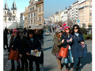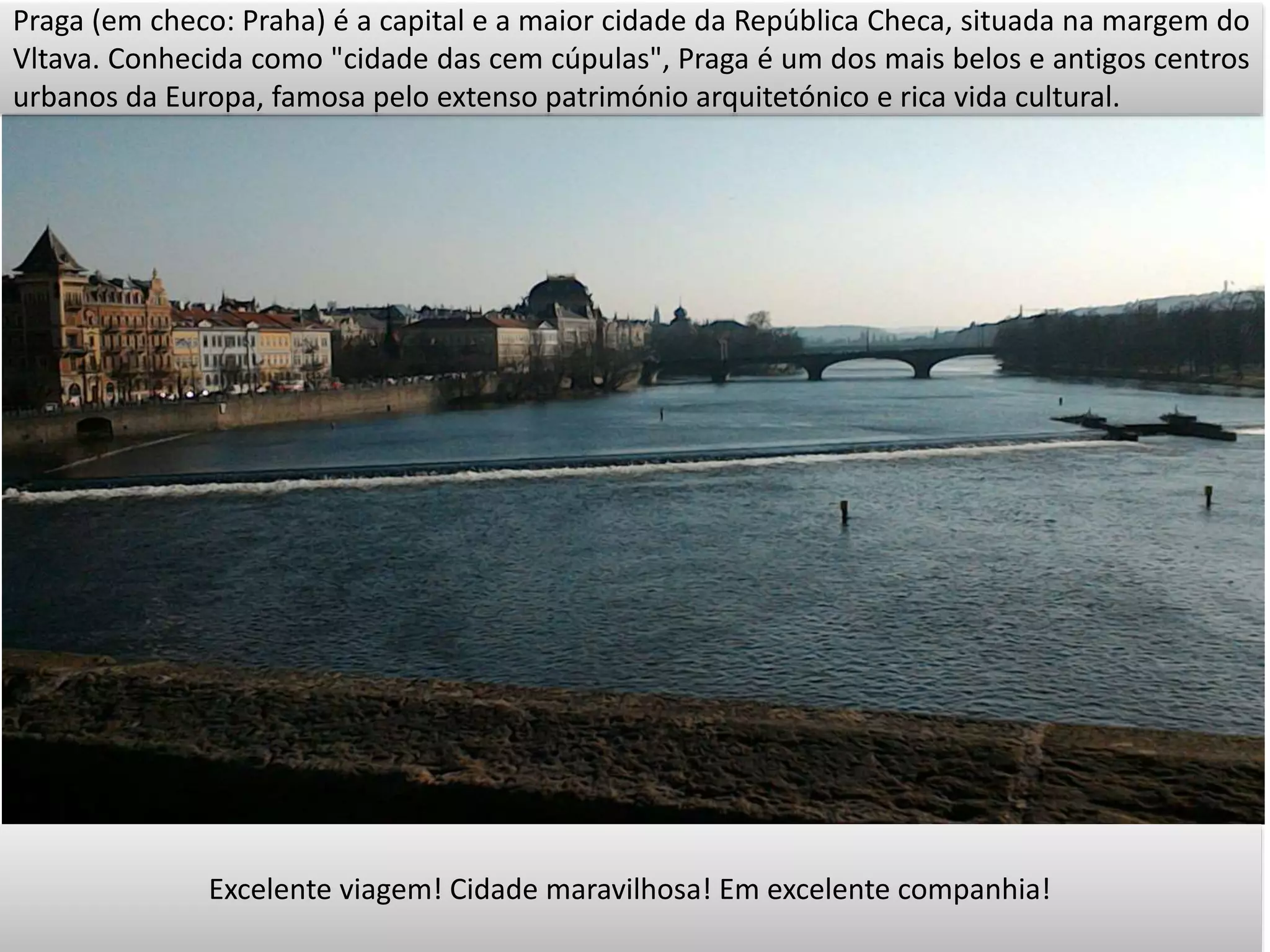 Praga é a capital e maior cidade da República Checa, situada às margens do rio Vltava. É conhecida como a "cidade das cem cúpulas" e é famosa pelo seu rico património arquitetónico e vida cultural. O documento descreve brevemente experiências de uma viagem a Praga, incluindo visitas a locais históricos, concertos musicais e apreciação da cultura local.