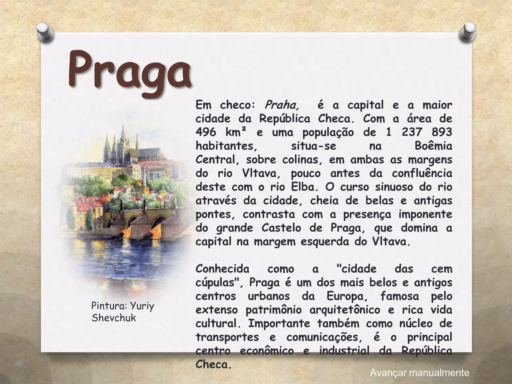 Praga é a capital e maior cidade da República Checa, localizada no centro da Boêmia às margens do rio Vltava. Conhecida como a "cidade das cem cúpulas", Praga é famosa por seu rico patrimônio arquitetônico que inclui o imponente Castelo de Praga e pontes sobre o rio sinuoso. Além de importante centro cultural, Praga também é o principal centro econômico e industrial do país.