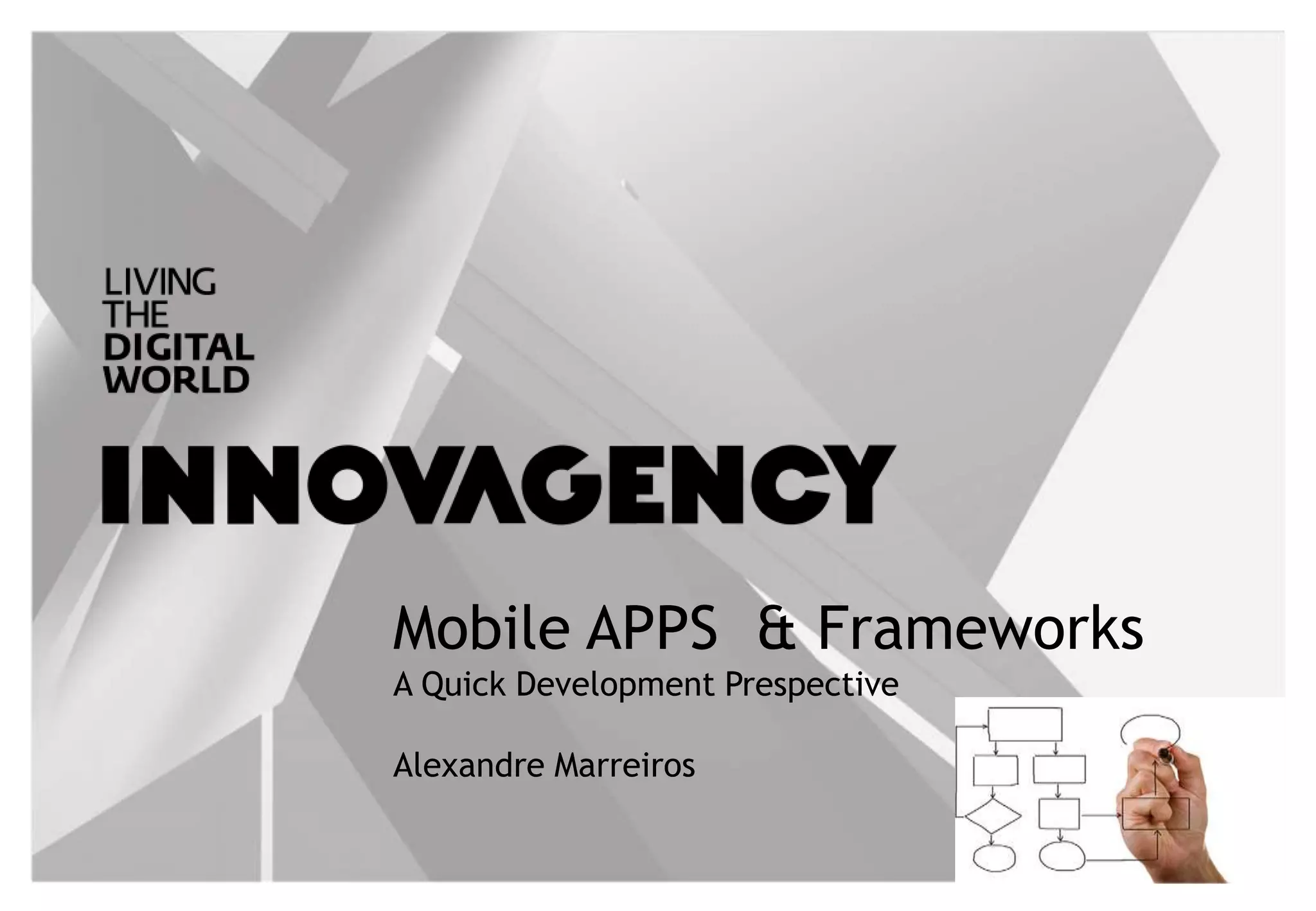 O documento apresenta uma visão geral sobre o desenvolvimento de aplicativos móveis, abordando aspectos como a experiência do usuário e opções de frameworks. Inclui dicas sobre como otimizar aplicativos para múltiplos dispositivos e sistemas operacionais. O autor, Alexandre Marreiros, é diretor técnico na Innovagency e compartilha insights sobre as melhores práticas no desenvolvimento de aplicativos móveis.