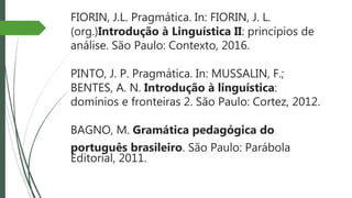 O documento apresenta um resumo sobre o que é pragmática. Aborda três grupos principais de estudos pragmáticos, como o pragmatismo norte-americano, os estudos de atos de fala e os estudos interdisciplinares. Também discute conceitos-chave como enunciação, enunciado, dêiticos e as instâncias enunciativas segundo Benveniste.
