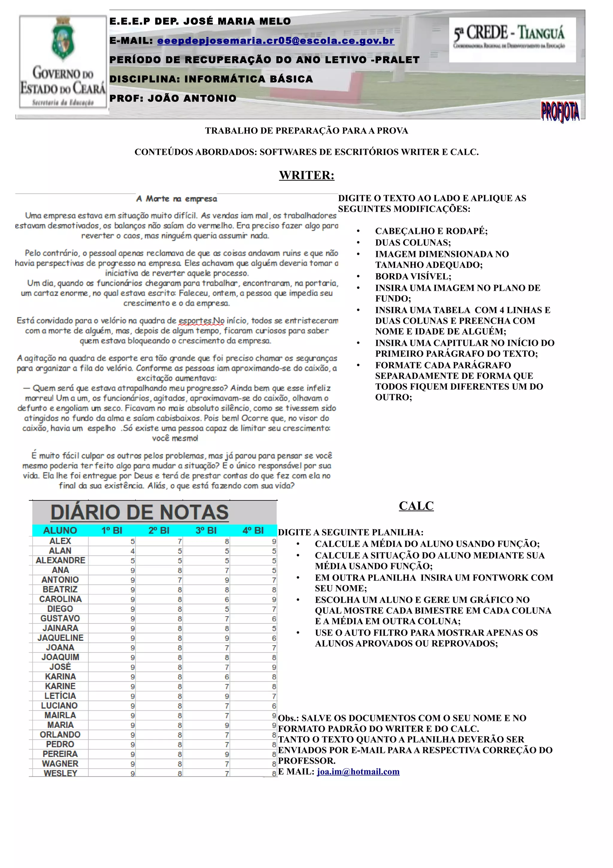 O documento fornece instruções para um trabalho prático sobre softwares de escritório Writer e Calc. Os alunos devem formatar um texto no Writer aplicando modificações como cabeçalho, rodapé, colunas, imagem, tabela e estilos de parágrafo. Eles também devem preencher uma planilha no Calc calculando média, situação do aluno, inserindo nome, gerando gráfico e usando filtro. Os arquivos devem ser salvos e enviados por e-mail para correção do professor.