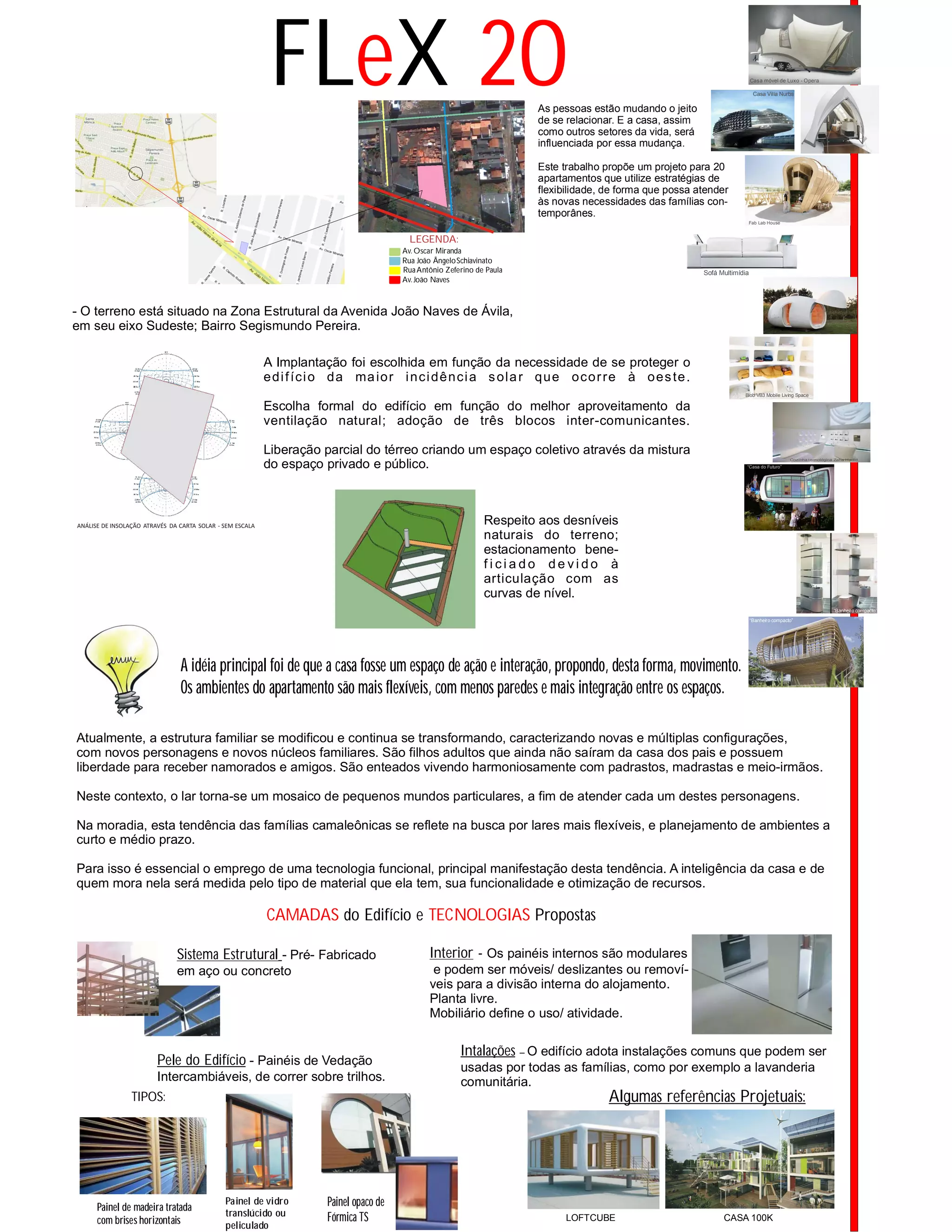 O documento discute estratégias de projeto arquitetônico para promover flexibilidade e integração de espaços em apartamentos, incluindo a implantação do edifício em função da ventilação natural e proteção solar, além de propor a liberação parcial do térreo para criar um espaço coletivo.