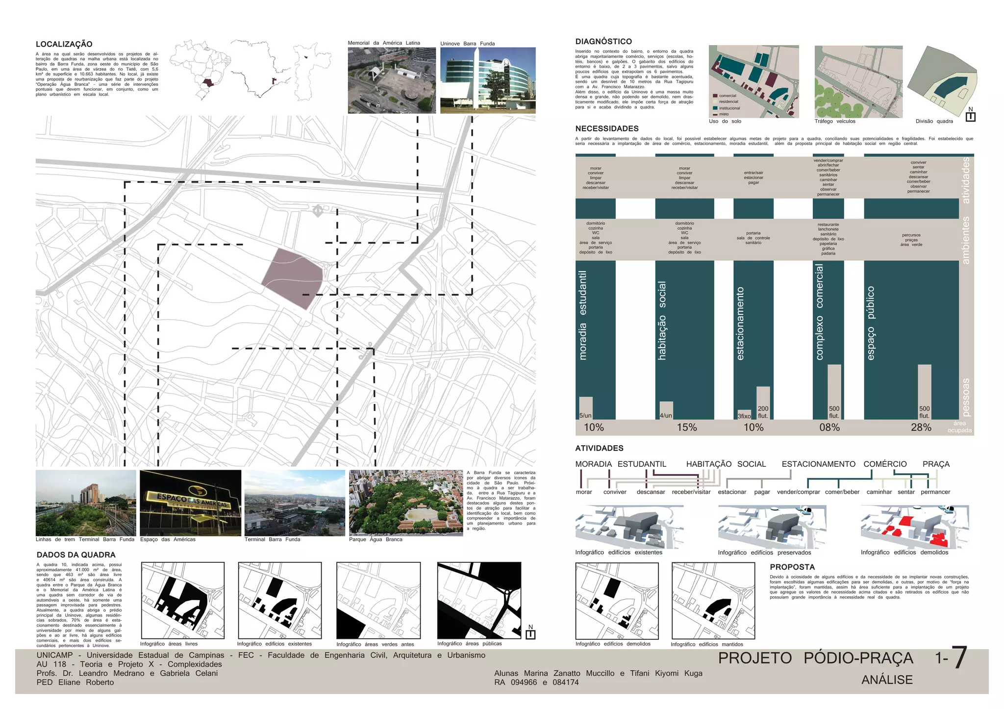 O documento apresenta um plano de reurbanização para a quadra 10 no bairro da Barra Funda, São Paulo, com foco em comércio, habitação social e moradia estudantil. O projeto propõe a construção de um pódio que eleva a quadra e melhora a integração dos edifícios existentes, e inclui um estacionamento subterrâneo e áreas verdes. Metas de projeto foram definidas com base na análise das necessidades e características da região, visando harmonizar a densidade proposta com a infraestrutura local.