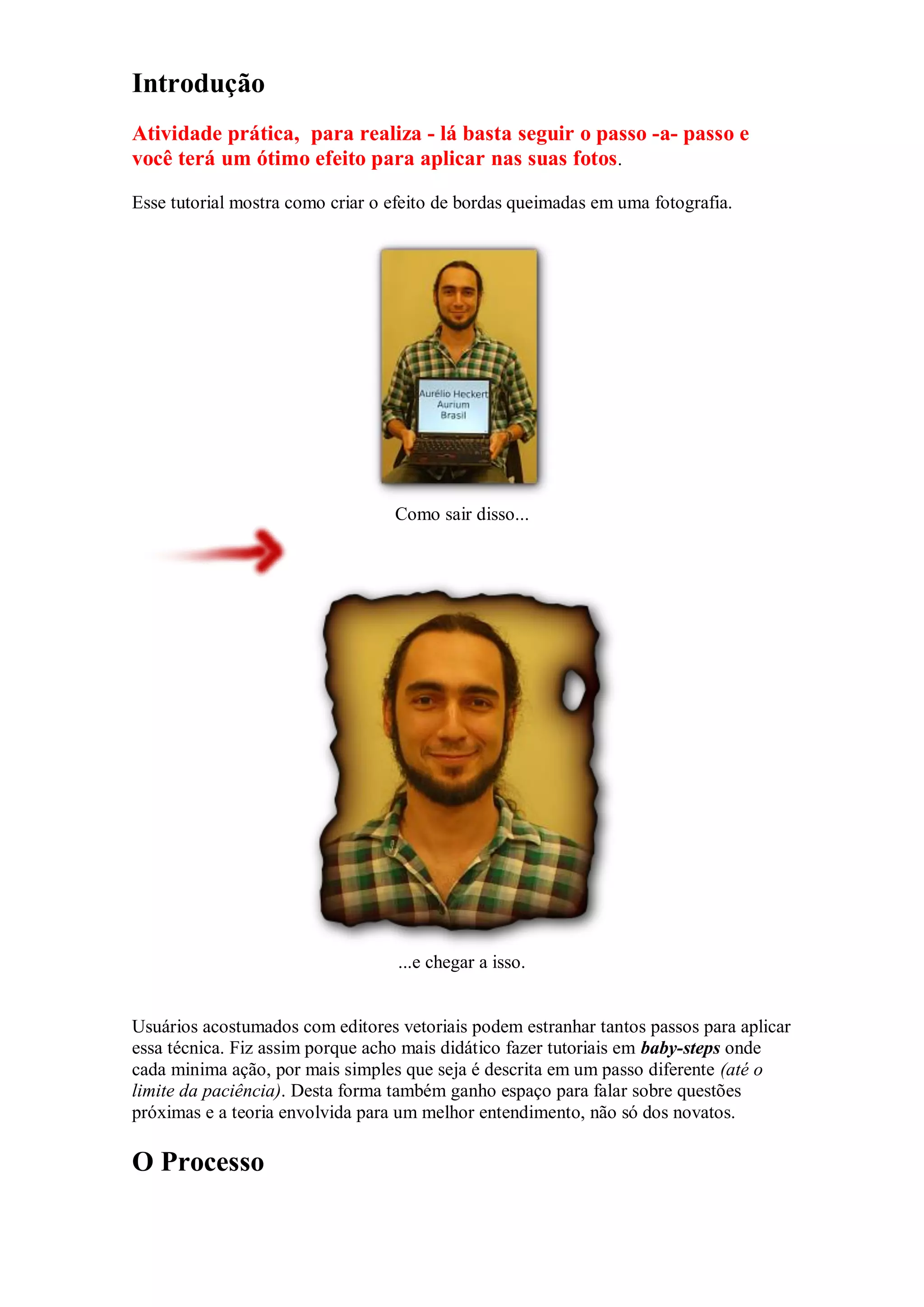 Este documento fornece um passo-a-passo detalhado para criar o efeito de bordas queimadas em uma fotografia usando o editor de imagens vetoriais Inkscape. O processo envolve importar uma fotografia, criar elementos geométricos e aplicar efeitos como fractalização e diferença para simular a borda queimada. Aplicações de cores, traços e desfoque criam a ilusão de manchas escuras ao redor da borda, completando o efeito.