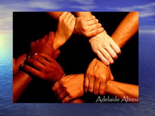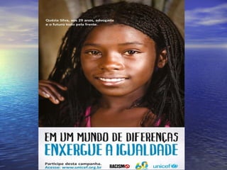 O documento discute o preconceito racial e a importância do respeito às diferenças. Apresenta a biografia da escritora Cristiane Sobral e poemas que abordam a identidade negra e a escravidão, como "Petardo". Também fala sobre o poeta Castro Alves e sua defesa dos escravos, e sobre a cantora Sandra de Sá e sua representação da cultura afro-brasileira. Por fim, resume o conto "Negrinha" de Monteiro Lobato, que mostra a realidade da escravidão.