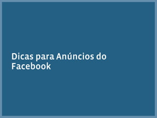 O documento fornece dicas para anúncios e páginas do Facebook, incluindo usar múltiplos ativos criativos nos anúncios, testar versões diferentes, usar imagens cativantes, relacionar eventos a causas, e promover páginas com anúncios de envolvimento. Também recomenda simplificar o conteúdo da página, inovar, estabelecer uma voz consistente e interagir com os fãs.