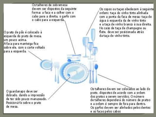 Itens de mesa como colheres, facas, garfos, copos e pratos são listados para preparar uma refeição. O documento deseja boa digestão para os leitores.