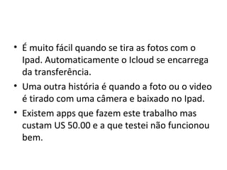 Fotos e vídeos tirados com o iPad são automaticamente transferidos para o iCloud. Fotos e vídeos de outras fontes precisam ser transferidos manualmente para o iPad. Apps pagos podem fazer esta transferência, mas nem sempre funcionam bem.