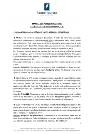 O documento resume as principais mudanças introduzidas pelo novo Código de Processo Civil brasileiro no que se refere aos prazos processuais, incluindo a contagem de prazos apenas em dias úteis, a suspensão de prazos no período de 20 de dezembro a 20 de janeiro, e a possibilidade de fixação de um calendário processual pelas partes e juiz.