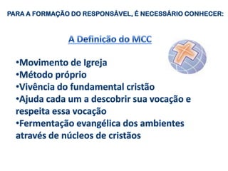 O documento aborda o Movimento de Cursilhos de Cristandade (MCC), enfatizando a vivência cristã, a evangelização e a preparação de candidatos. Destaca as etapas do pré-cursilho, cursilho e pós-cursilho como essenciais para o desenvolvimento do movimento. O papel dos cursilhistas envolve buscar e preparar candidatos, além de acompanhá-los em sua jornada de fé.