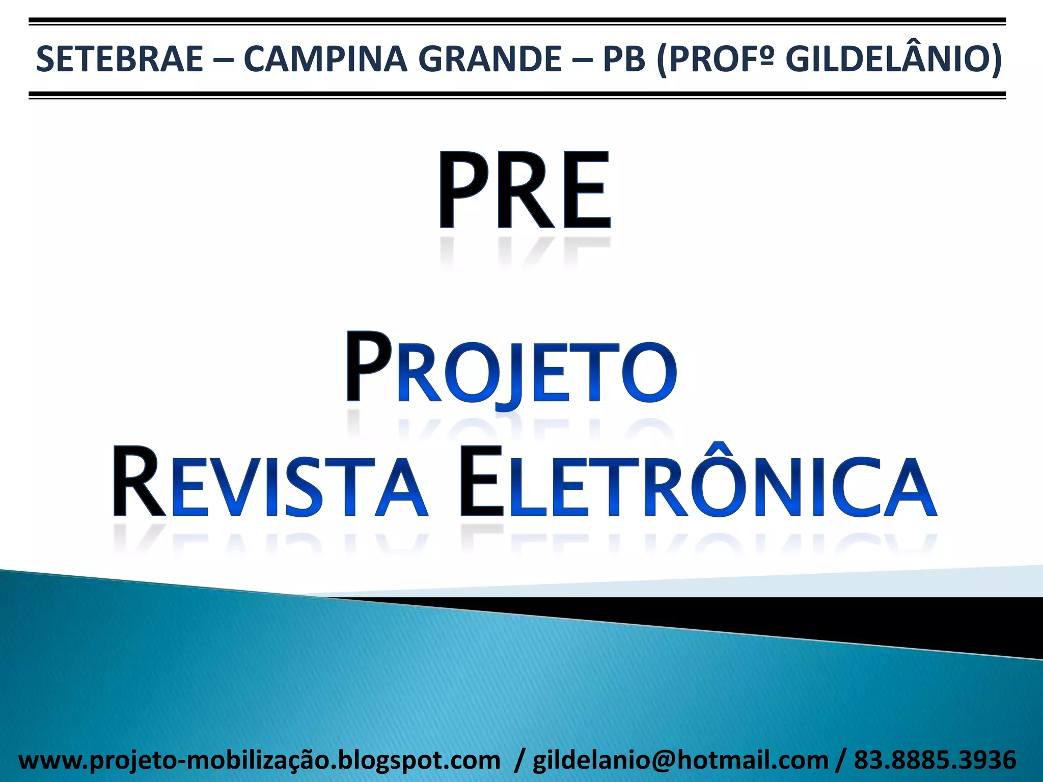 O documento descreve o Projeto Revista Eletrônica (PRE), uma iniciativa para produção de textos acadêmicos entre alunos e professores de uma escola teológica. O PRE tem como objetivos incentivar a produção de artigos, desenvolver o interesse na elaboração de textos, e criar um blog para publicar os artigos com o intuito futuro de publicar um livro.