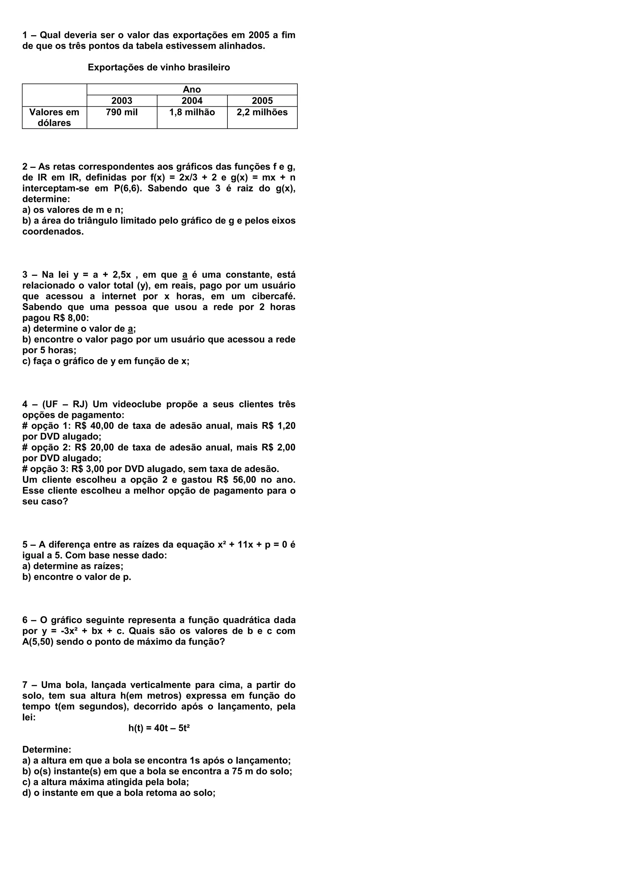 2) O documento apresenta sete problemas de matemática sobre funções, equações, gráficos e situações relacionadas a movimento.