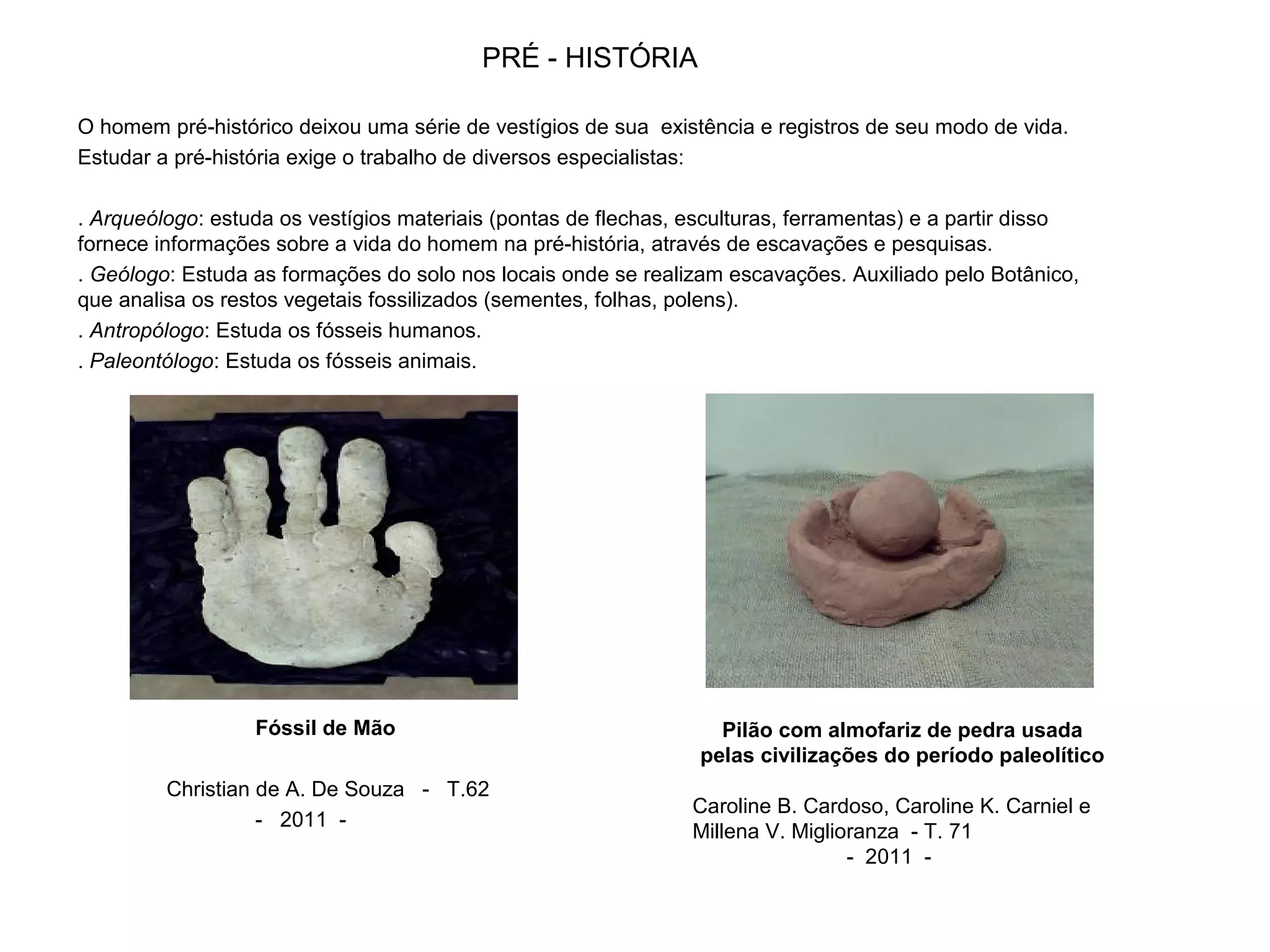 O documento discute a pré-história e a arte pré-histórica, descrevendo como arqueólogos, geólogos, antropólogos e paleontólogos estudam vestígios do passado. Ele também descreve as ferramentas, vestuário, moradias e técnicas desenvolvidas por povos pré-históricos.