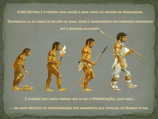 O documento descreve a pré-história da humanidade desde os primeiros hominídeos até a invenção da escrita, incluindo os períodos Paleolítico e Neolítico. Durante o Paleolítico, os humanos evoluíram da caça-colecção para o domínio do fogo e da bípede. No Neolítico, a agricultura e a pecuária levaram à sedentarização, aldeias e cidades, e monumentos megalíticos.