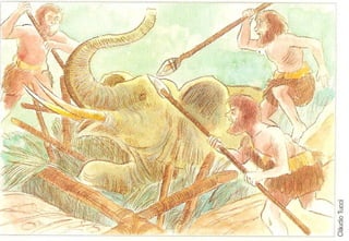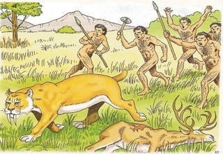 O documento descreve as principais características dos períodos Paleolítico e Neolítico da Pré-História, quando os humanos eram caçadores-coletores nômades e depois se tornaram agricultores sedentários. Também menciona a conquista do fogo e o surgimento da agricultura, cerâmica e assentamentos permanentes no Neolítico, além da substituição gradual da pedra por metais como cobre e bronze na Idade dos Metais.