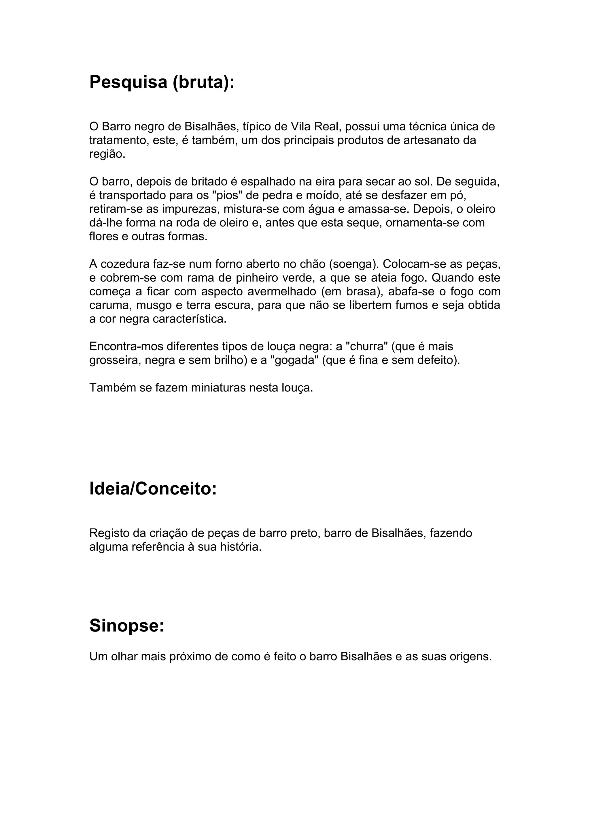 O documento descreve o processo de criação do barro preto de Bisalhães, desde a extração do barro até a cozedura no forno, resultando em peças com a característica cor negra. Detalha as etapas de moagem, amassamento, moldagem e ornamentação antes da cozedura em forno aberto coberto com rama verde, dando ênfase na técnica única desta região.