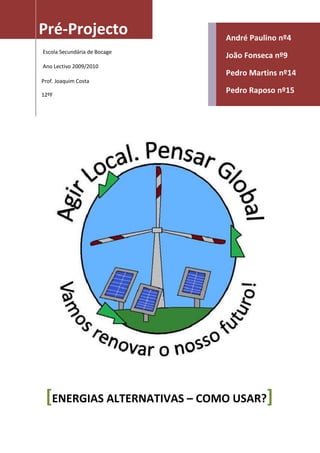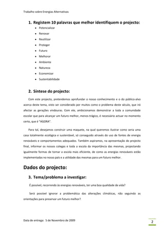 Este projeto visa sensibilizar a comunidade escolar sobre as energias renováveis e comportamentos sustentáveis através da construção de uma maquete de uma casa ecológica e da apresentação do projeto. O grupo pretende mostrar como as energias renováveis podem permitir uma boa qualidade de vida no futuro e incentivar a adoção destas soluções para preservar o planeta.