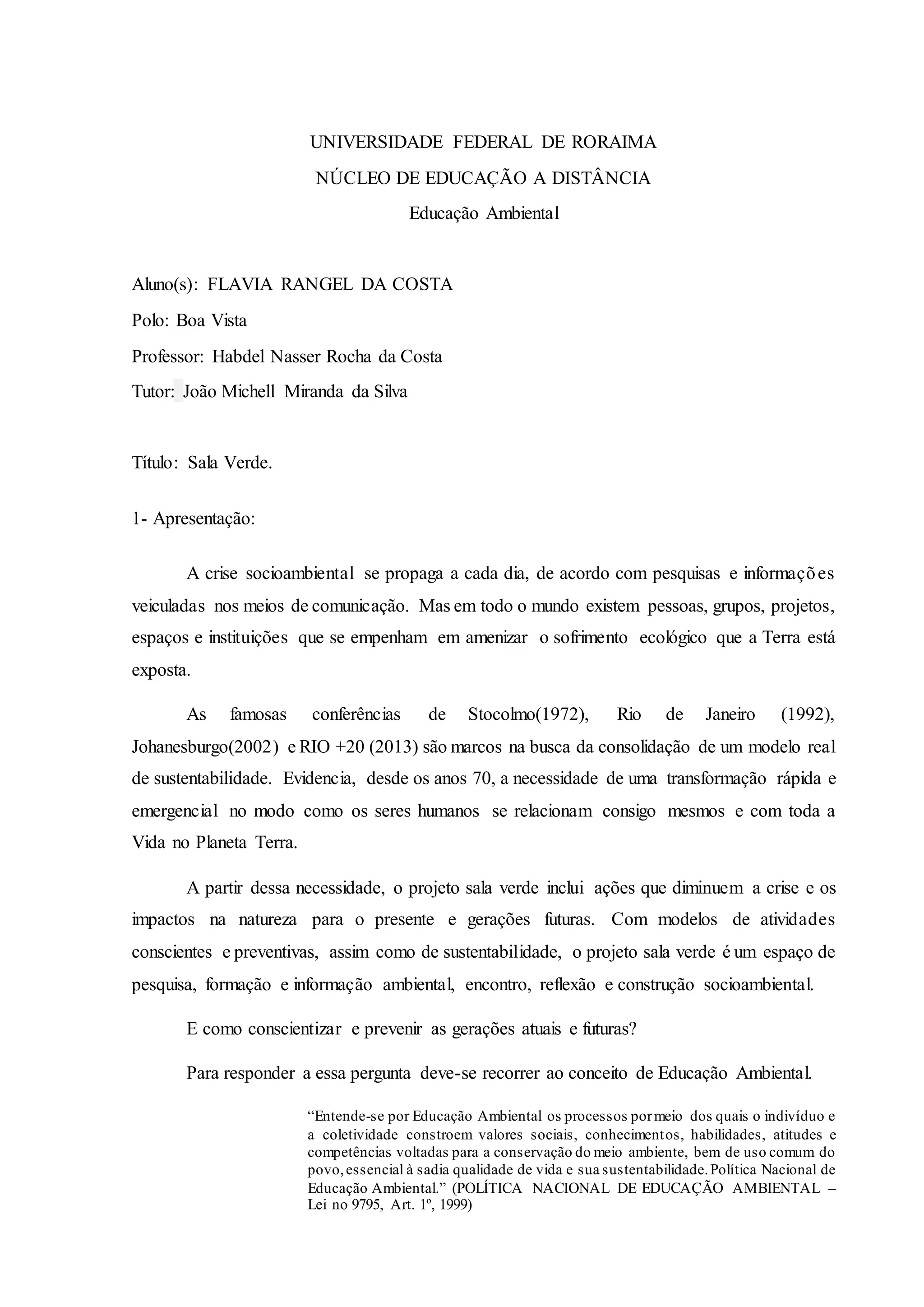 O documento discute a importância da Sala Verde como espaço de educação ambiental nas escolas. A Sala Verde visa conscientizar estudantes sobre a crise ambiental e a necessidade de desenvolvimento sustentável, promovendo oficinas, hortas e atividades que estimulem o cuidado com o meio ambiente. O projeto se baseia nos princípios da educação ambiental definida na Política Nacional de Educação Ambiental para formar cidadãos comprometidos com a preservação dos recursos naturais.