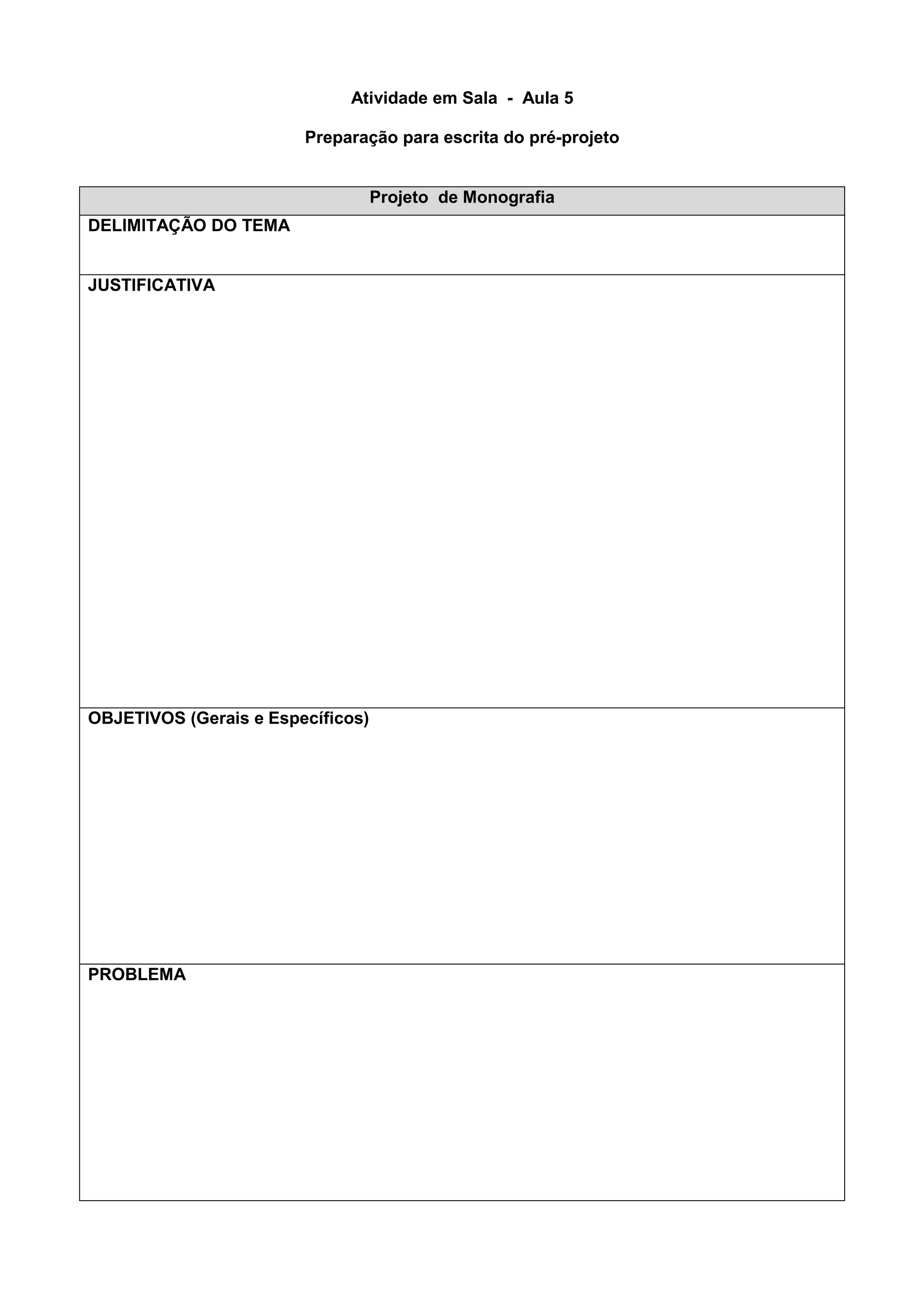 O documento fornece uma estrutura para o pré-projeto de uma monografia, listando seções como delimitação do tema, justificativa, objetivos, problema, hipóteses, referencial teórico, procedimentos metodológicos, cronograma e bibliografia.
