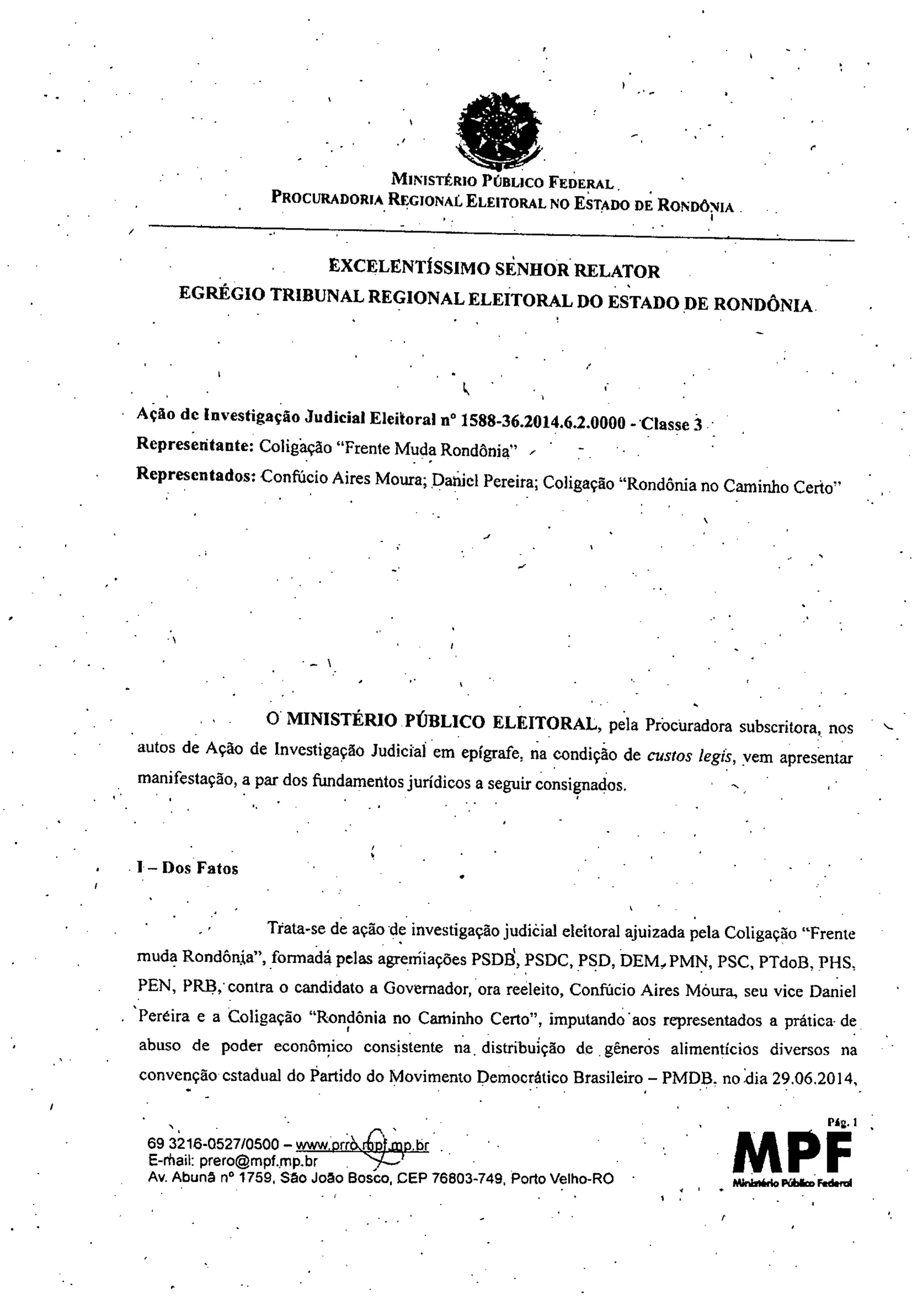 Este documento trata de uma ação de investigação judicial eleitoral movida contra o governador reeleito de Rondônia, Confúcio Aires Moura, e sua coligação, acusando-os de abuso de poder econômico. O Ministério Público Eleitoral analisa embargos declaratórios opostos pelas partes e conclui que parte dos embargos devem ser rejeitados, enquanto outros merecem parcial acolhimento.