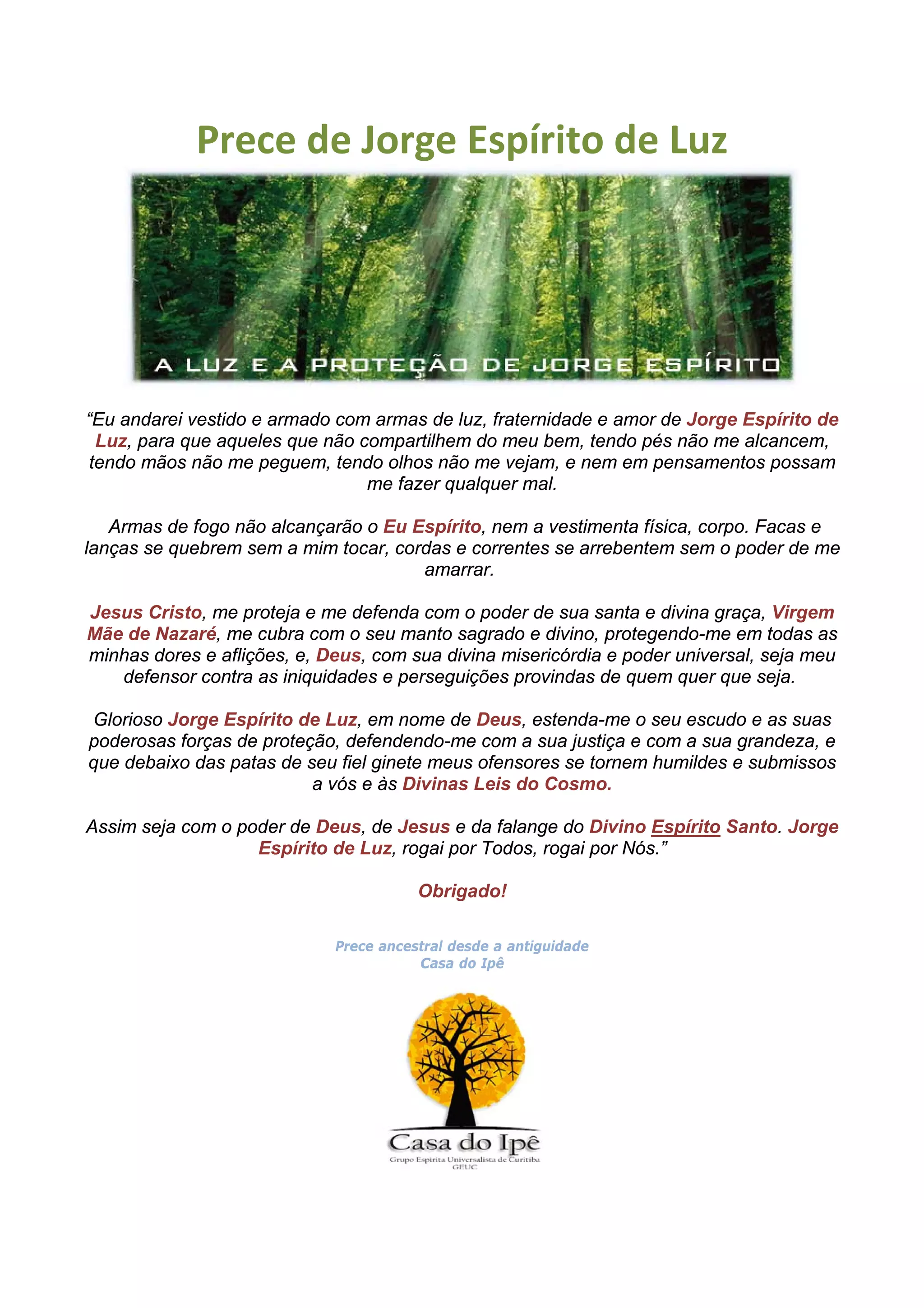 A prece pede proteção de Jorge Espírito de Luz contra inimigos, usando armas de luz, fraternidade e amor. Também pede proteção de Jesus Cristo, Virgem Maria e Deus contra perseguições. Finalmente, pede que Jorge Espírito de Luz estenda seu escudo de proteção e forças contra ofensores.