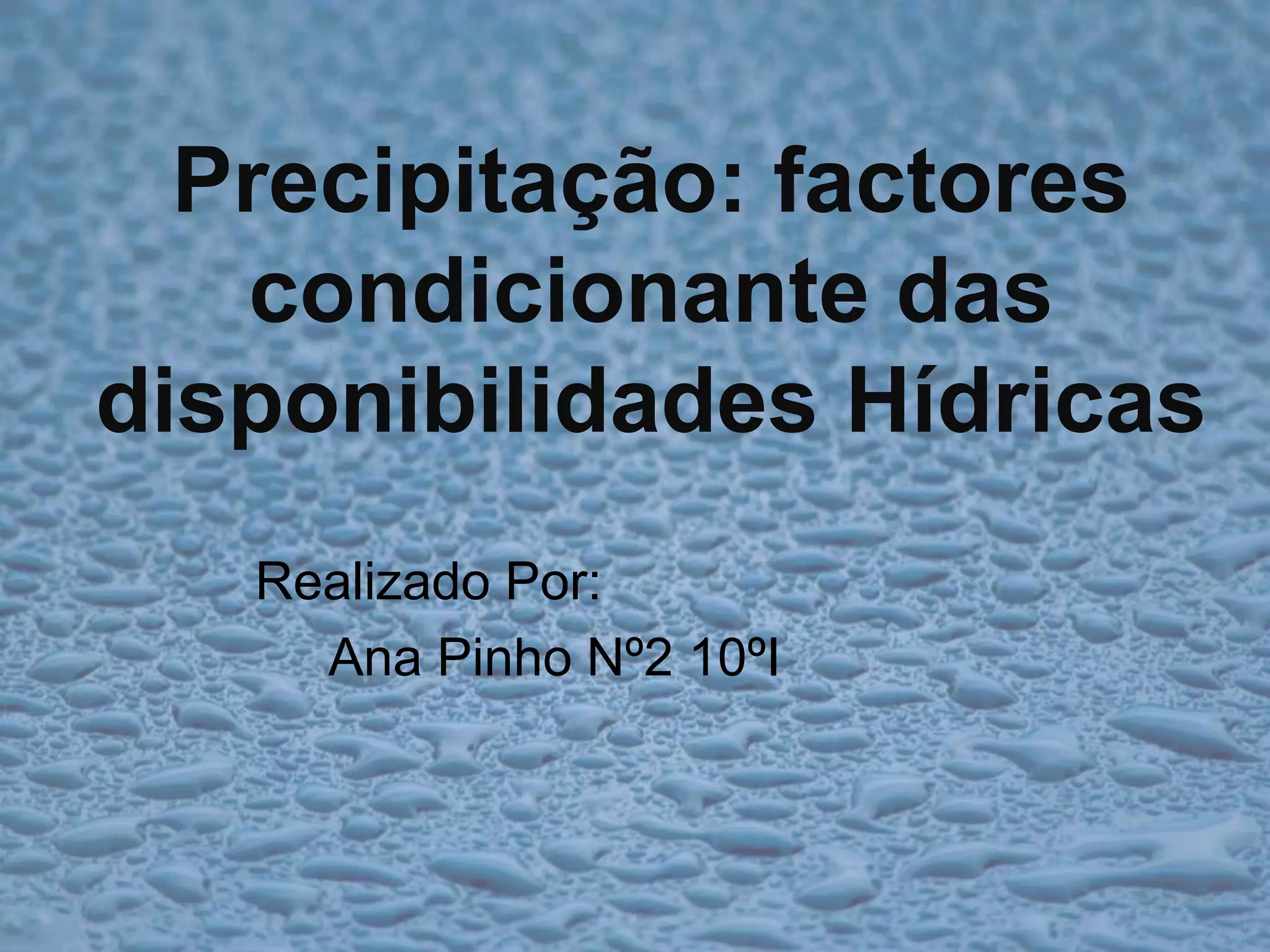 O documento discute os fatores que afetam a disponibilidade hídrica em Portugal, incluindo a precipitação, distribuição das águas subterrâneas, disponibilidades hídricas que variam entre o norte e sul do país, e as redes hidrográficas e bacias hidrográficas compartilhadas entre Portugal e Espanha.