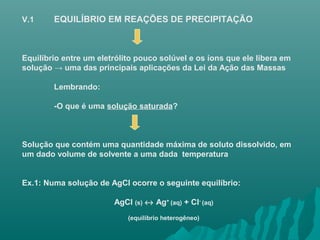 O documento discute equilíbrio químico em reações de precipitação. Apresenta o conceito de produto de solubilidade (Kps) e como ele pode ser usado para prever a formação ou dissolução de precipitados. Fatores como adição de solvente, variação de temperatura e presença de íons comuns ou diversos podem afetar o valor de Kps e a solubilidade de um sal.