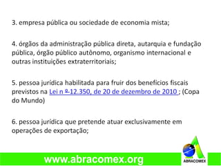 O documento apresenta informações sobre habilitação de empresas para operações de comércio exterior no Brasil, destacando requisitos legais e tipos de habilitação. Também discute a documentação necessária para importação e exportação, além das normas fiscais e incoterms que regulam tais operações. O texto enfatiza a importância de profissionais especializados, como despachantes aduaneiros e agentes de cargas, para garantir a conformidade no comércio internacional.