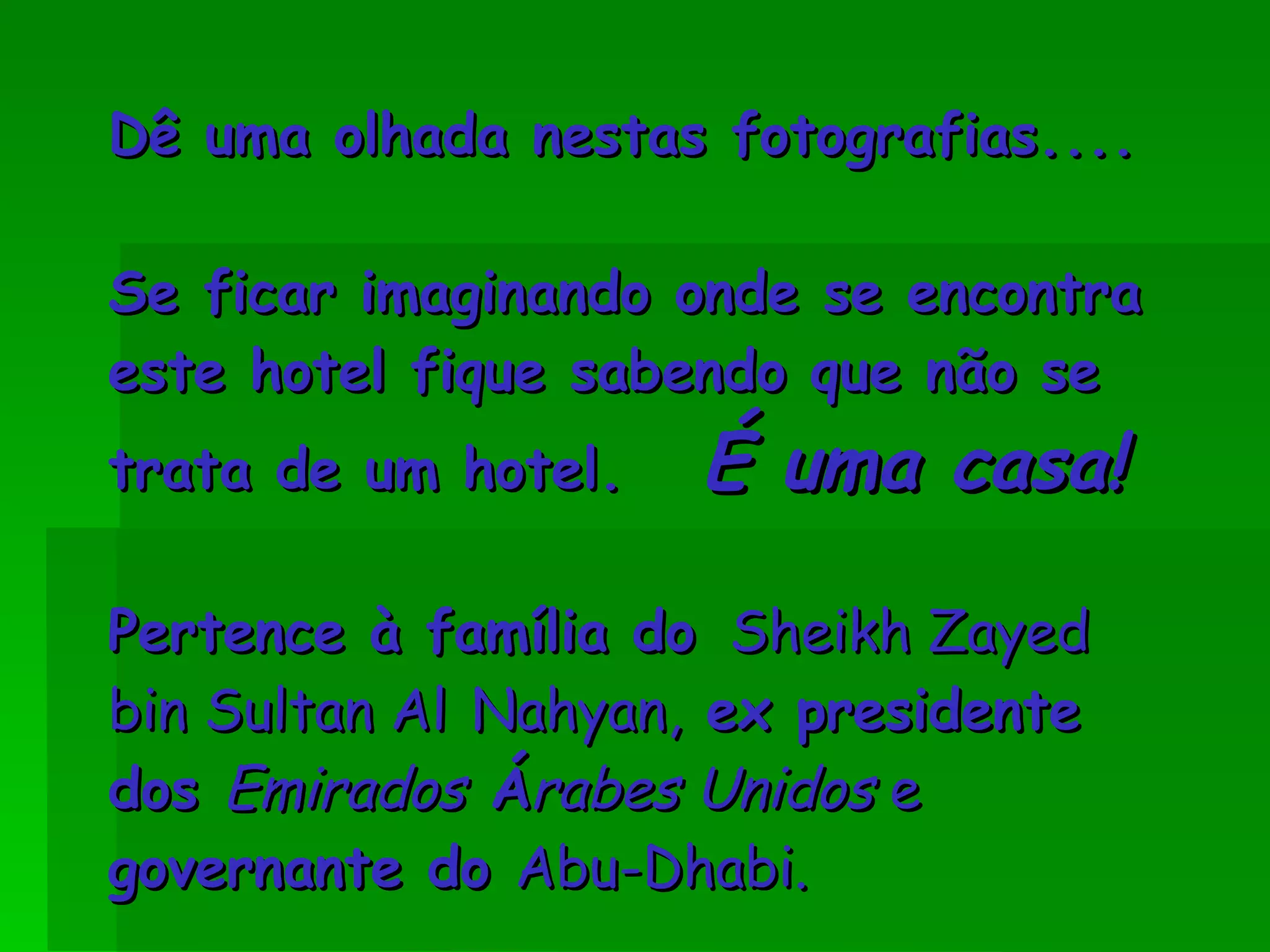 Dê uma olhadanestas fotografias.... Se ficar imaginando onde se encontra este hotel fique sabendo que não se trata de um hotel. É uma casa! Pertence à família do Sheikh Zayed bin Sultan Al Nahyan, ex presidente dos Emirados Á rabes Unidos e governante do Abu-Dhabi .