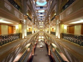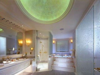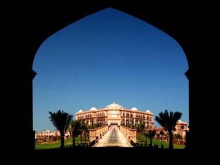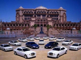 Este documento descreve uma casa que pertence à família do ex-presidente dos Emirados Árabes Unidos. A casa não é um hotel, apesar de seu tamanho e luxo, e contém um carro totalmente feito de prata.