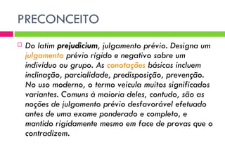 O documento discute os conceitos de preconceito, discriminação e homofobia. Apresenta as principais formas de preconceito como racial, social e sexual. Também aborda leis contra a discriminação na Constituição brasileira e casos reais de preconceito e ataques homofóbicos.