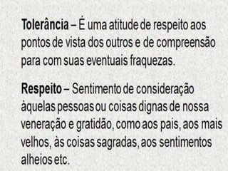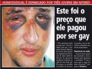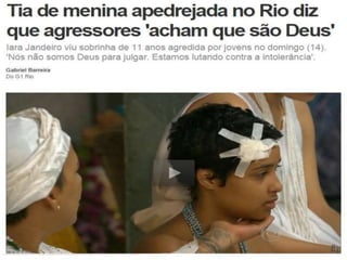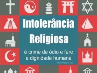 O documento discute a intolerância religiosa, racial, sexual e política no Brasil. A Constituição Federal proíbe a discriminação baseada em raça, sexo, cor, idade ou religião. Leis definem crimes de ódio e preconceito como puníveis. Os dados mostram altos índices de violência contra mulheres e pessoas negras no país.