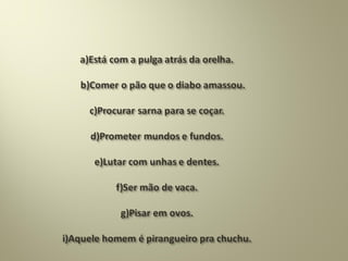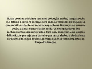 1) O documento discute o tema da variação linguística e preconceito linguístico. Apresenta diversos exemplos de como a língua varia de acordo com fatores como região, época, grau de instrução e situação comunicativa.