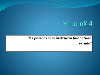Este documento discute vários mitos sobre preconceito linguístico no Brasil. Apresenta como a norma culta da língua portuguesa é usada para marginalizar outras variedades linguísticas e como o ensino da gramática tradicional tenta impor uma única forma de falar. Também questiona a ideia de que o domínio da norma culta leva automaticamente à ascensão social.