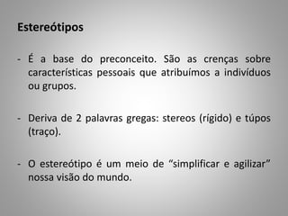 O documento discute estereótipos, preconceitos e discriminação. Estereótipos são crenças sobre características atribuídas a grupos que podem levar a generalizações incorretas. Experimentos nos EUA mostraram que crianças negras já internalizavam estereótipos de inferioridade racial aos 3 anos. Preconceitos têm estereótipos como base cognitiva e sentimentos negativos como componente afetivo, podendo levar a discriminação. Competição, bodes expiatórios, fatores de personalidade e norm